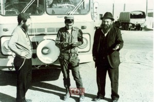 מבצע תפילין עם חיילי צה"ל בתעלת סואץ, תשל"א. מצד ימין נראה הרה"ח ר' מאיר פרידמן ז"ל מראשי פעילי צא"ח. מזהים מי החסיד משמאל? רמז: ה... | לצילום בצבע
