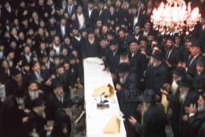 הרבי בהתוועדות, פורים תש"ל | צולם ע"י ר' שמואל ריבקין שיחי' מחלון חדר השידורים, הצופה על פני ההתוועדות | צילום מוגדל