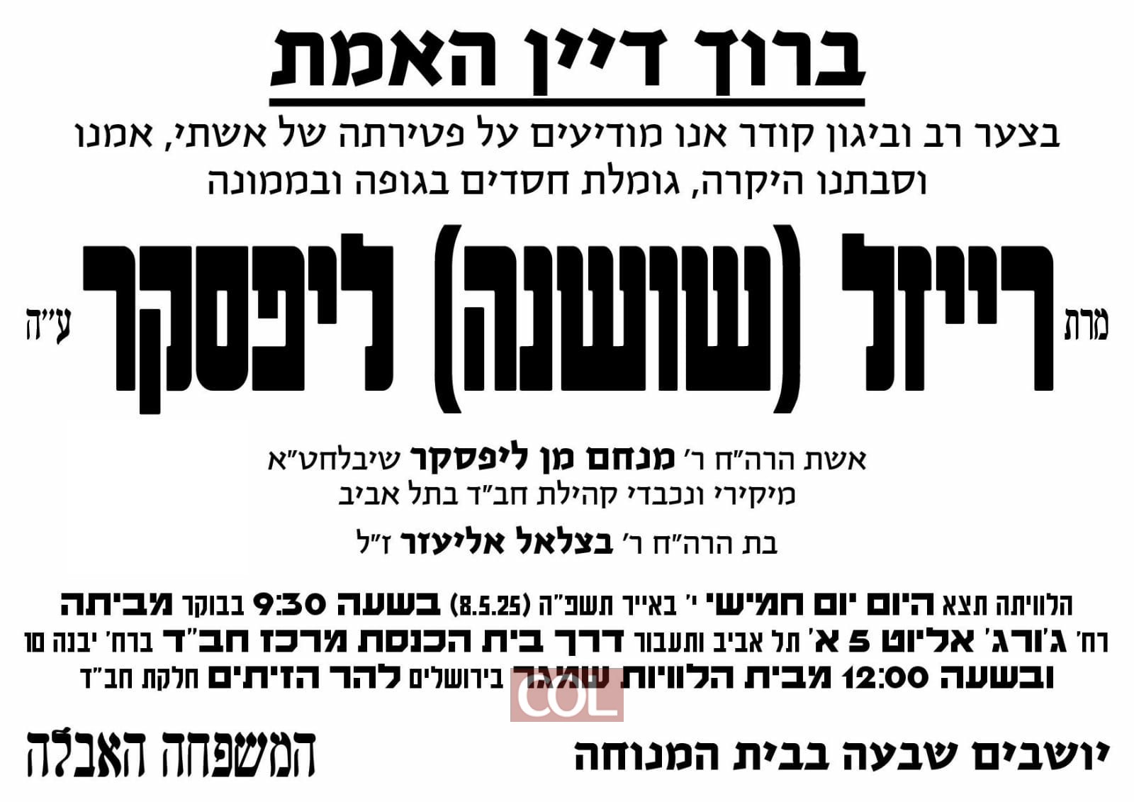 בצער רב התקבלה הידיעה על פטירתה של מרת רייזל שושנה ליפסקר ע"ה, אשת יבדלחט"א הרב מנחם מן ליפסקר שיחי' מוותיקי קהילת חב"ד תל אביב. הותירה אחריה ילדים, נכדים ונינים ההולכים בדרך החסידות. המשפחות האבלות: ר' פנחס ליפסקר- פתח תקווה הגב' ברכה שפירא - באר שבע הגברת חנה סלומון - ניו גרזי ר' צבי ליפסקר - פתח תקווה הגברת שבי חן - חשמונאים הלוויתה יוצאת היום (חמישי) בשעה 9:30 מביתה ברחוב ג'ורג' אליוט 5 בתל אביב ותעבור בבית הכנסת מרכז חב"ד ברחוב יבנה 10, ובשעה 12:00 מבית הלוויות שמגר בירושלים להר הזיתים, שם תיטמן. ת.נ.צ.ב.ה.