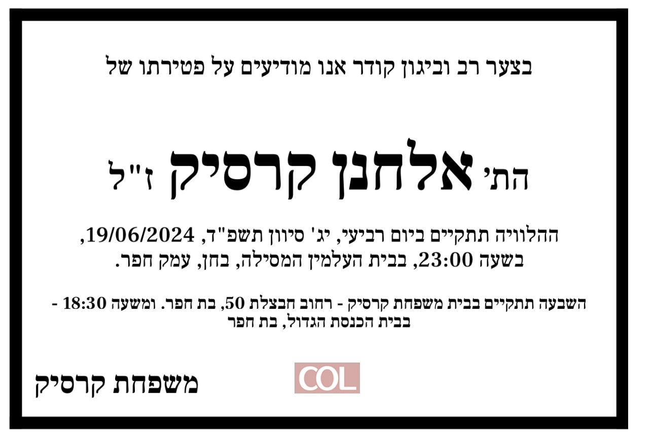 בצער רב מתקבלת הערב הידיעה על פטירתו של התמים אלחנן קרסיק מעמק חפר, בנם של יבדלו לחיים הרב יוסף קרסיק ורעייתו | ההלוויה תתקיים הערב בשעה 23:00 בבית העלמין המסילה, בחן, עמק חפר | שבעה בבית המשפחה - רחוב החבצלת 50 עמק חפר, ומשעה 18:30 בבית הכנסת הגדול ביישוב