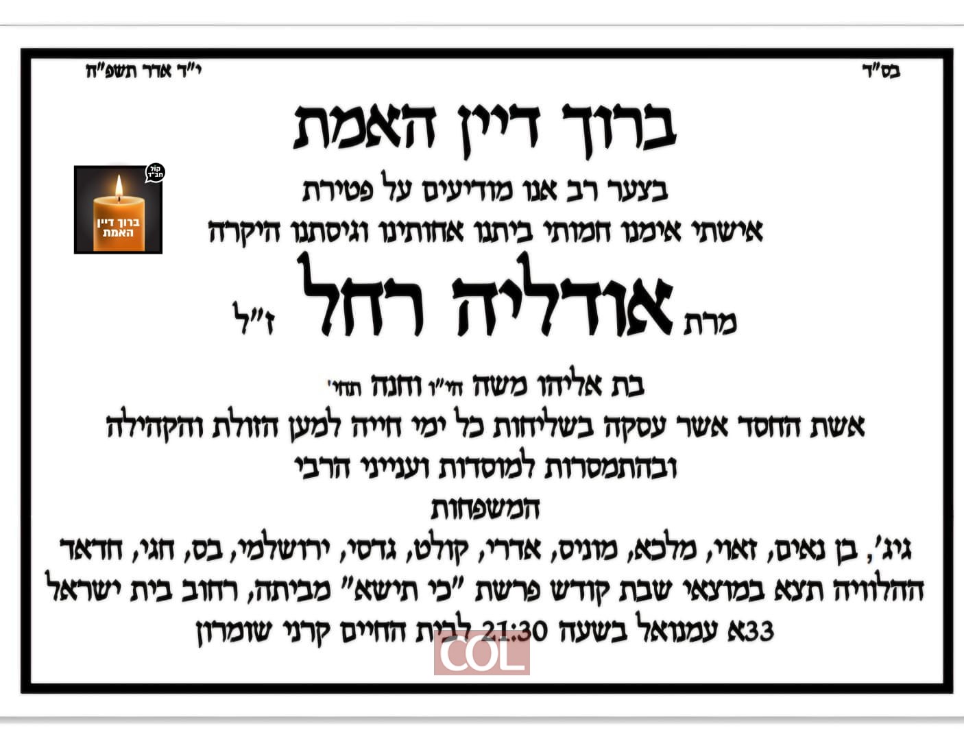 בצער רב מתקבלת הבוקר (רביעי, ט"ו באדר תשפ"ו) הידיעה על פטירתו של הרב אהרן זוהר ע"ה, מחשובי חסידי חב"ד בבני ברק. זכה והעמיד תלמידים במשך שנים רבות ורבים נעזרו על ידו. שימש כגבאי בבית כנסת חב"ד ברחוב רש"י בבני ברק, ובלט במאור הפנים שלו והחום שהקרין כלפי כל אדם. בניו: ר' שאול זוהר - כאן ציווה ה' את הברכה הרב שלום זוהר- כפר סבא ר' לוי זוהר - שדה בר ר' שניאור זוהר - לוד בנותיו: הגב' שלומית חיל - לוד הגב' רבקה מזרחי- רחובות הגב' חנה זכריהו- בני ברק הגב' מרים ימפל - בני ברק הגב' הדס לעפקאוויטש- לינדן ניו ג'רסי הגב' מושקא קרב - חריש הגב' רותא אמיתי - בני ברק והקיצו ורננו שוכני עפר והוא בתוכם הלווייתו תתקיים היום יום רביעי בשעה 11:30 בבני ברק, ותצא מביתו ברחוב רבי עקיבא 147 ותעבור דרך בית הכנסת ברחוב רש"י. משם תמשיך ההלוויה לעבר בית העלמין בצפת, שם ייטמן. יושבים שבעה בביתו. ברוך דיין האמת
