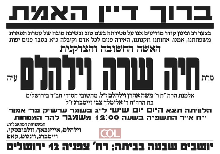 בל"ג בעומר בשבוע שעבר נפטרה לבית עולמה האישה החשובה מרת חיה שרה וילהלם מירושלים, אלמנת הרב משה אהרן וילהלם ע"ה ואם למשפחה חב"דית עניפה. מחר יום חמישי תקום המשפחה מה"שבעה"