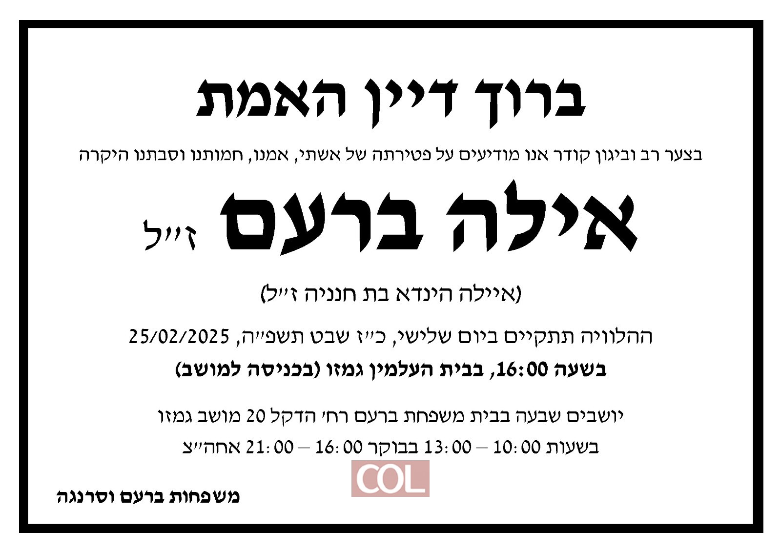 בצער רב מתקבלת הידיעה על פטירתו של אילה ברעם ז"ל, אמו של השליח למושב גמזו יבדל לחיים הרב עמי ברעם | ההלווייה תתקיים היום בבית העלמין במושב ושבעה יישבו עד שבוע הבא | שעות הניחומין במודעה המצורפת