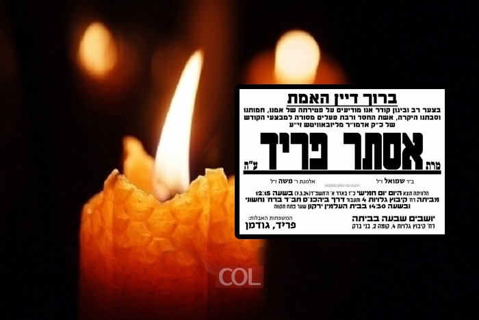לפנות בוקר נפטרה האשה החשובה מרת אסתר פריד ע"ה, מוותיקות נשות חב"ד בבני-ברק ובעבר מגדל-העמק. הותירה אחריה דור ישרים מבורך: בנה הת' יעקב פריד ובתה השליחה מרת מלכה לאה גודמן מאשדוד. אשת חסד ורבת פעלים, מסורה למבצעי הקודש של הרבי. הלווייתה יוצאת היום חמישי מביתה רח' קיבוץ גלויות 4, דרך בית חב"ד ברחוב נחשוני ומשם בשעה 14:30 בבית העלמין ירקון בפתח תקווה. המשפחות האבלות פריד וגודמן, יושבים שבעה בביתה, רחוב קיבוץ גלויות 4 קומה 2. ברוך דיין האמת.