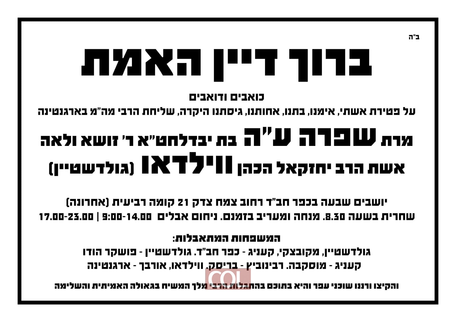 ואת ילדיהם: הרב אברהם, משלוחי הרבי בנתיבות, יוסף יצחק מכפר חב"ד, מרת רחל סויסה מבאר שבע, מרת תמר כהן, מרת מרים דינה מור יוסף, מרת אורנה נחמה טנג'י ומרת אסתר ועקנין - כולן מכפר חב"ד.