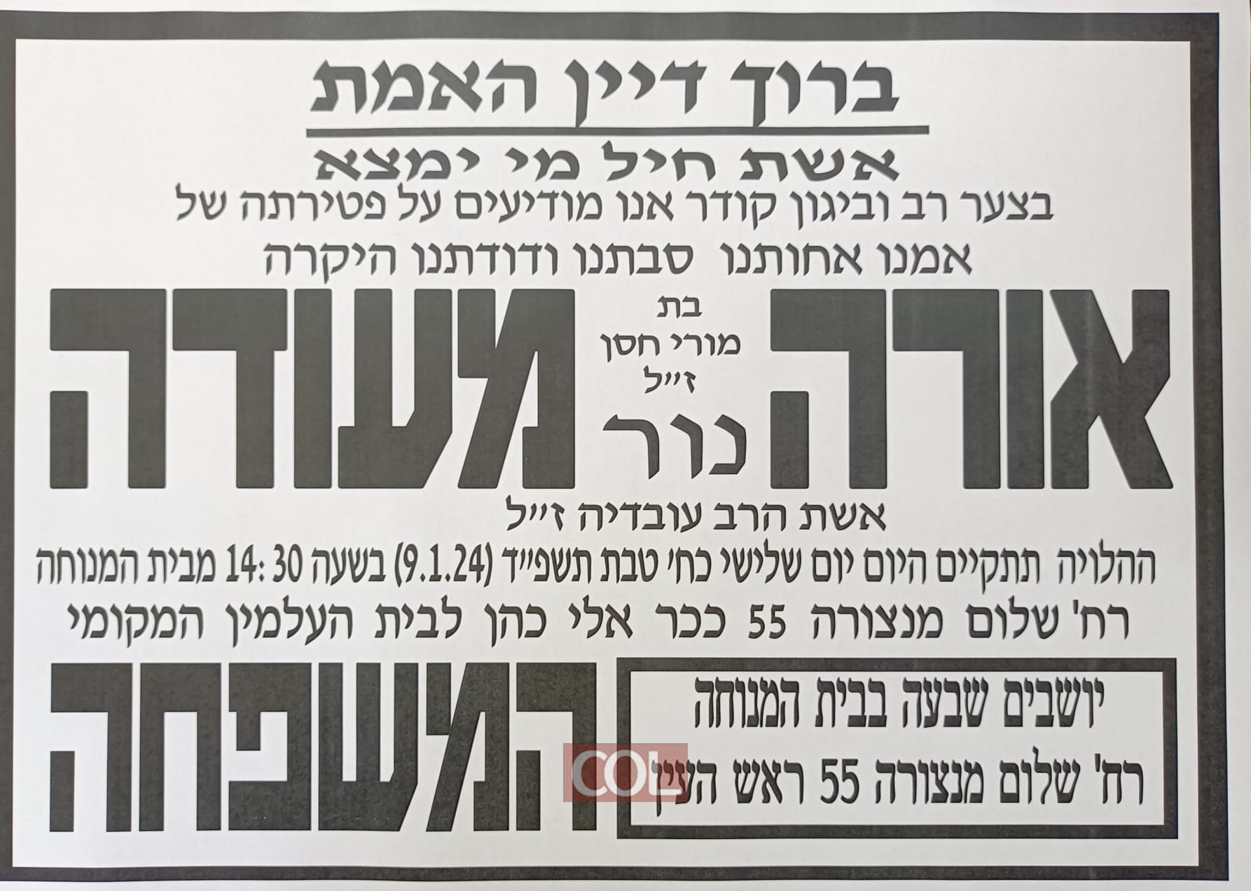 הבוקר, כ"ח בטבת תשפ"ד, הלכה לעולמה מרת אורה בת עדבה מעודה ע"ה, אמם של יבדלו לחיים טובים - הרב יאיר מעודה מ נתניה, הרב יורם מעודה מ צפת ו הרב יואל מעודה מכפר חב"ד
