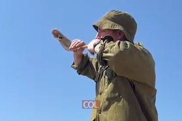 "אִם יִתָּקַע שׁוֹפָר בְּעִיר וְעָם לֹא יֶחֱרָדוּ": לוחם מחיל התותחנים תוקע בשופר לפני שחבריו יורים את הפגזים לעיר עזה. צילום: 'עזר לחייל' כפר חב"ד. צפו: