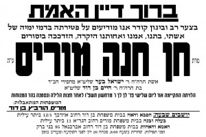 אמש (שני) נפטרה בביתר מרת חנה מוֹרִיס ע״ה, בדמי ימיה, לאחר שנזדככה בייסורים. המנוחה אשת הרה״ח ר׳ ישראל בער שיחי'... | ברוך דיין האמת
