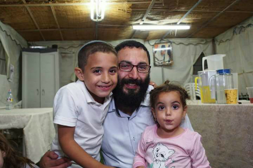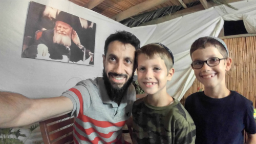 בתמונה: שיינר ובניו התאומים בסוכתם.