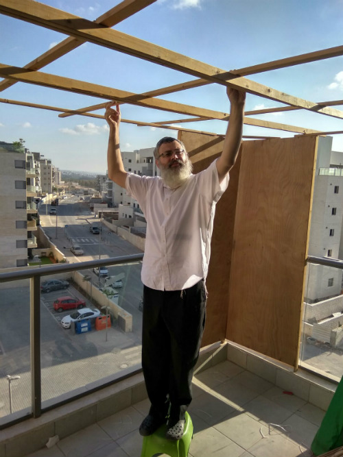 בתמונה: אחיטוב בונה דירת ארעי זמנית, במרפסת.