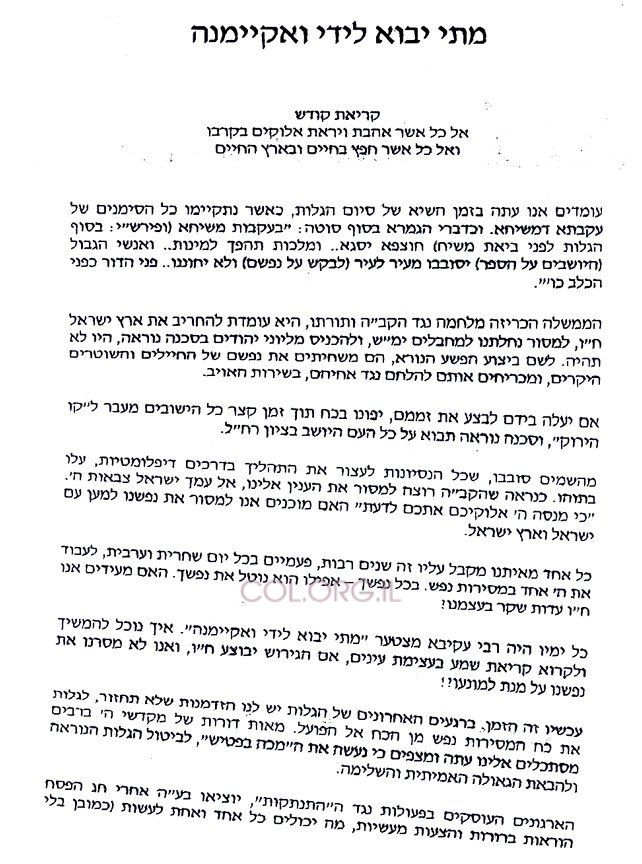 "עיני כל ישראל אלינו עתה. זוהי הדרך היחידה שבה נוכל לעצור את תהליך ההתאבדות. זוהי הדרך היחידה לקדש שם שמים לעיני העמים. זוהי הדרך היחידה שבה נוכל להוכיח לפושעי המלחמה כי לה', לעמו ולאצרו הישועה! ויהי רצון שחפץ ה' בידינו יצליח, ועוד הרב הלפני יום הפקודה ח"י תמוז, יתבטלו כל התוכניות, ועם ישראל ישכון בטח בדד עין יעקב, בביאת משיח צדקנו".