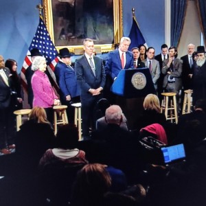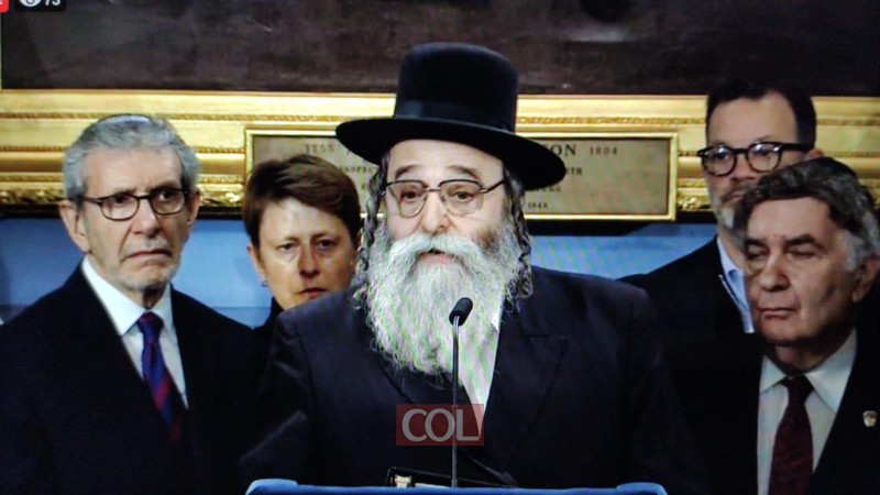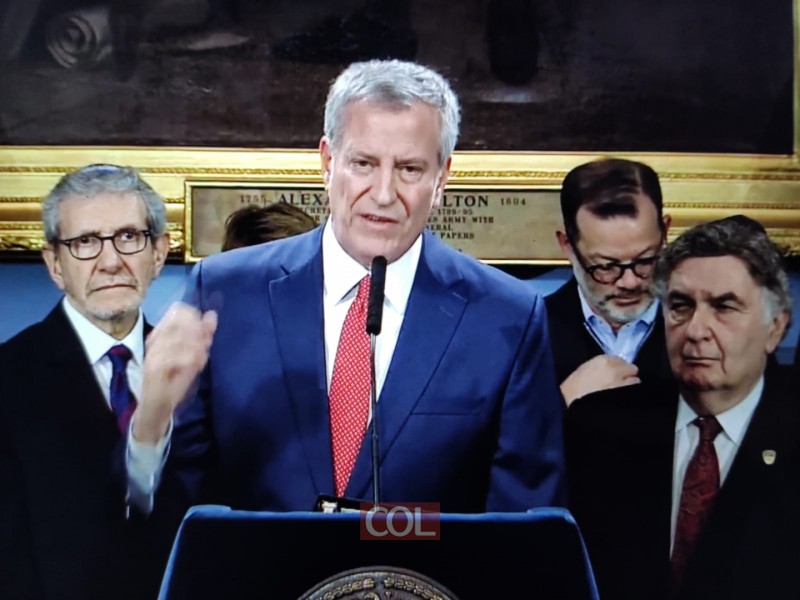 מסיבת עיתונאים עם ראש העיר ניו-יורק ביל דה בלאזיו, בעקבות עלייה במקרי האנטישמיות ופשעי השנאה. לצדו של ראש העיר, נצפה העסקן החב"די ר' חנינא שפערלין מקראון הייטס