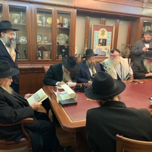 כעת בלשכת הרב הראשי לרוסיה, השליח הרב בערל לאזאר: עריכת הכתובה לקראת החתונה הערב, של החתן התמים מנחם מענדל ווילענסקי עב"ג הכלה דבורה לאה לאזאר, במוסקבה.