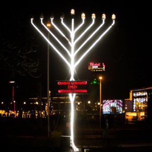 ארץ, אל תכסי: חנוכייה בחצר בית חב"ד מול קניון ארקדיה על ציר תנועה ראשי בורשה בירת פולין