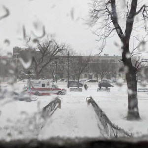 זווית מיוחדת: תיעוד של סופת השלגים בקראון הייטס, כפי שנראה מחלון דלת הכניסה הראשית ל'בית חיינו' 770, הצופה לשדרת איסטרען פארקווי