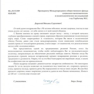 הרב הראשי של רוסיה הרב בערל לאזאר, שיגר היום אגרת ברכה לנשיא הראשון של ברית המועצות מיכאיל גורבצ'וב, ליום הולדתו ה- 90 ובשם כל הקהילה היהודית של רוסיה, איחל לו הרב אורך ימים מתוך בריאות טובה (שייע בטוויטר)