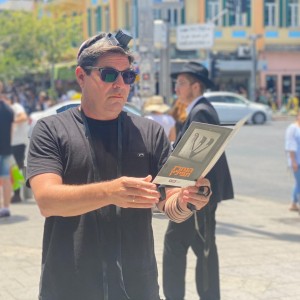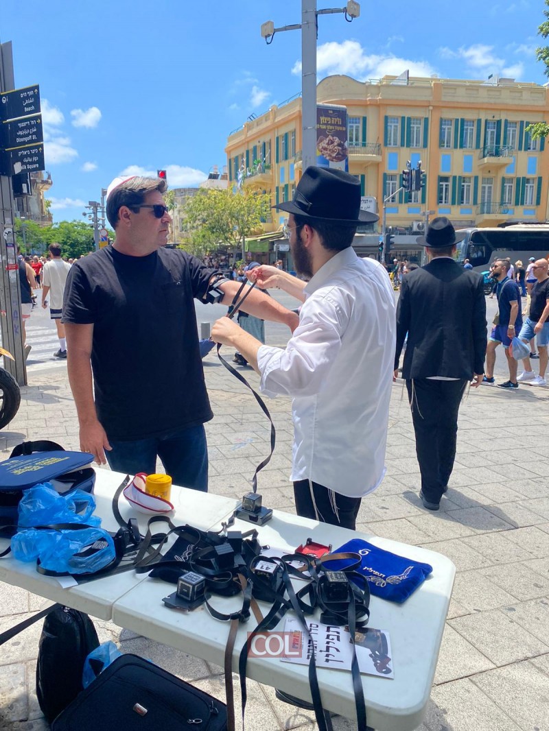 דוגמא אישית לעוברי האורח: השר לשיתוף פעולה אזורי, חבר הכנסת אופיר אקוניס, בהנחת תפילין לקראת שבת ברחוב המלך ג'ורג' בתל אביב