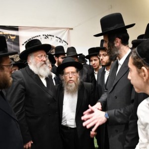 רבני העיר בני ברק הרב הגאון יצחק אייזיק לנדא והרב הגאון שבח רוזנבלט בסיור משותף ביריד הספרים הענק של 'המבשר' כשהם מלווים על ידי מנכ"ל המבשר ר' משה פרוש (צילום: 'חדשות המדיה')