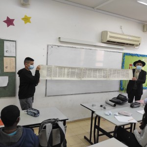 הרב יוסף הרטמן, המתנדב עשרות שנים בגימנסיה 'דרכא' בקריית מלאכי ומכין נערים לבר מצווה, מדגים לתלמידים איך ניראת מגילת אסתר על קלף