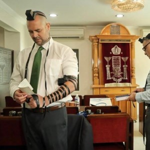 יממה לקראת הפסח: יושב-ראש הכנסת ח"כ אמיר אוחנה מניח תפילין בבית חב"ד במומבאיי, בו נרצחו שישה יהודים בפיגוע הטרור בשנת 2008, בהם שלוחי הרבי - הרב גבריאל ורבקי הולצברג הי"ד