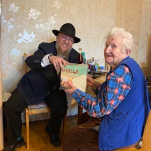 חלוקת מצות בבית אבות על ידי השליח הרב אברהם ליבשיץ יחד עם בנו צביקי, בבית חב"ד בית דוד, מוסקבה רוסיה