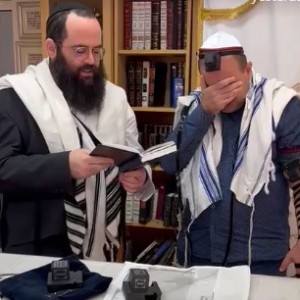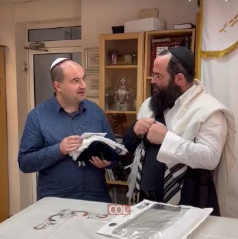 יהודי בן 44 שעלה לתורה לראשונה בחייו בחג שמחת תורה בבית חב"ד בעיר סופיה שבבולגריה, מקבל מהשליח הרב יוסף סלמון תפילין במתנה