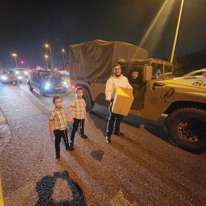 מושיטים יד לעזרה: שליח חב"ד בשכונת פסגות אפק בראש העין - הרב שניאור כהן ובניו, מביאים את החבילות שהכינו עם חברי הקהילה לחיילי צה"ל בדרכם למלחמה בעוטף עזה