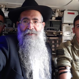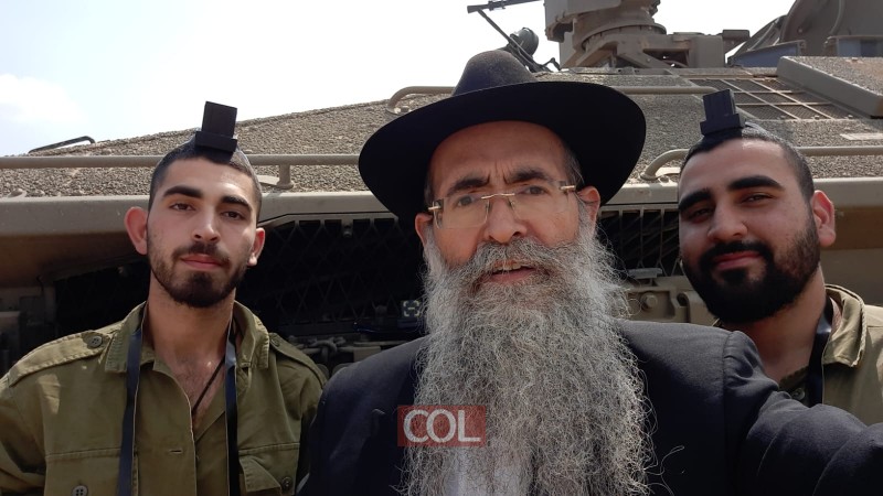 הרב אברהם יפרח שליח הרבי לנתיבות מניח תפילין ומחלק מזון ללא לאות לחיילי צה"ל, תוך כדי ירי הטילים על יישובי העוטף. בתמונה: שיריונרים מניחים תפילין בתוך הטנק רגע לפני כניסתם ללחימה בעוטף עזה