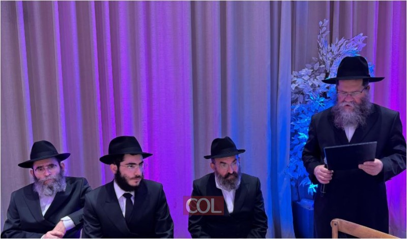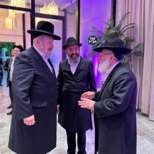 בחתונת משפחות יפרח - כפר חב"ד בר לב - ביתר עילית, נצפה המשפיע הרב זלמן גופין עם אבי הכלה, נציג חב"ד וסגן ראש העיר ביתר עילית הרב מאיר בר לב, ולצד ראש העיר הרב מאיר רובינשטיין • צילום: מנדי שיף