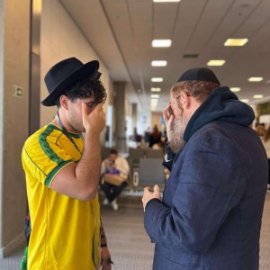 שליח חב"ד בברצלונה שבספרד - הרב דוד ליברזון, מזכה צעיר יהודי בהנחת תפילין ומדגים לו כיצד לומר את 'שמע ישראל' כאשר ידו מכסה את עיניו