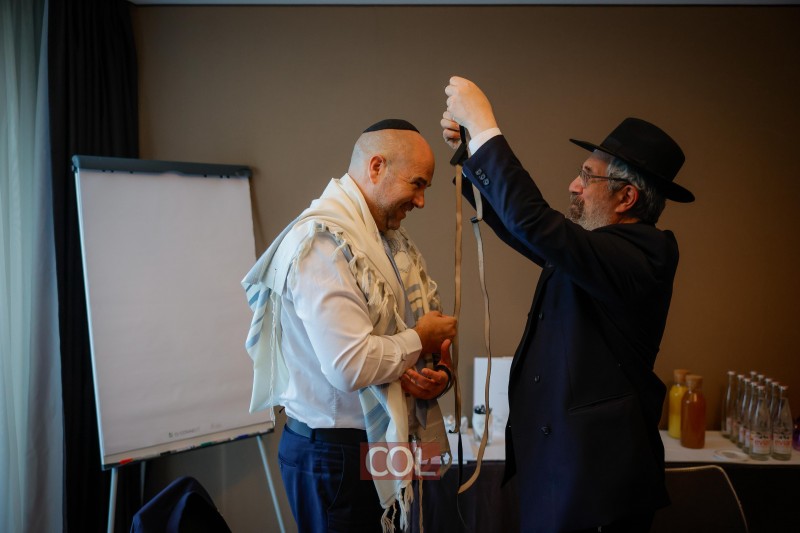 בכנס ראשי הפרלמנטים העולמי בז'נבה נפגש יו"ר הכנסת ח"כ אמיר אוחנה עם השליח הרב מענדל פעווזנער, הניח תפילין ואמר פרק תהילים לשלום ארה"ק, חיילי צה"ל, והחזרת החטופים. צילום: נועם מוסקוביץ, דוברות הכנסת