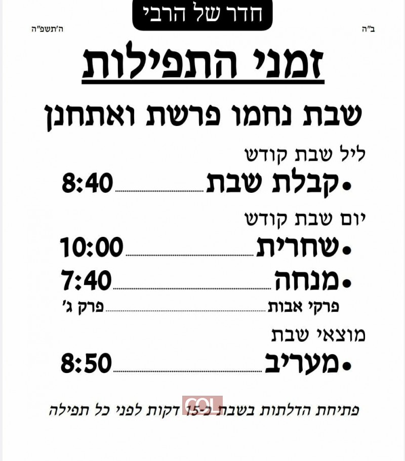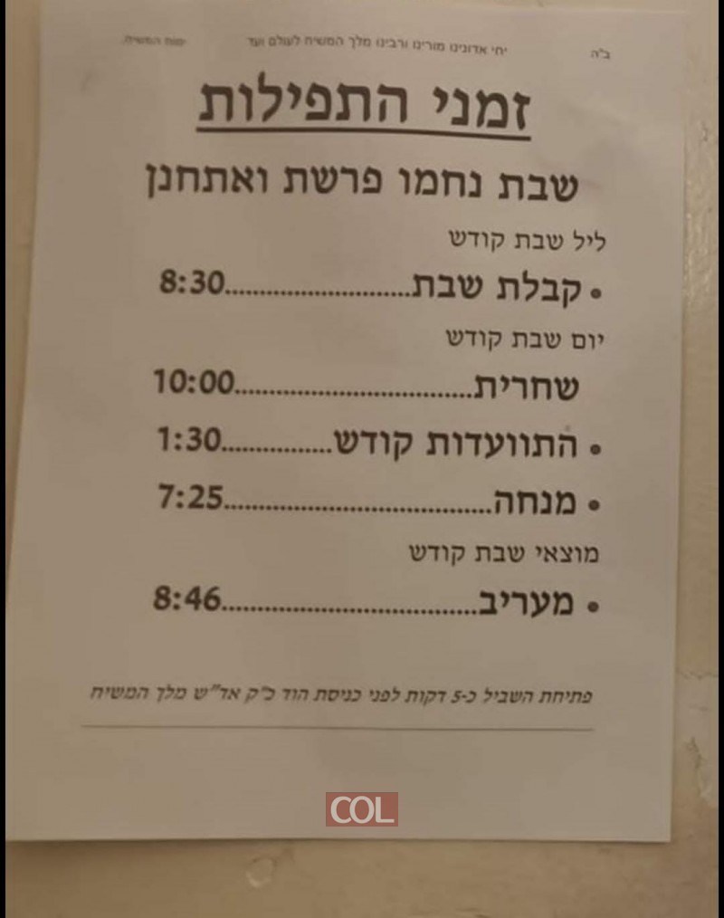 770, ניו יורק – אירוע חמור ומקומם אירע בערב שבת וגם בשבת ח' אב ב-770, מרכז חב"ד העולמי, כאשר בחור המשתייך לקבוצת פורקי עול נצפה כשהיא מסיר שלטים רשמיים שהיו תלויים על דלת חדר הכניסה של הרבי, ומחליף אותם בשלטים מזויפים המכילים מסרים הקשורים ב'שביל', מניינים בשעה זהה לשעה הרשמית וכדומה.