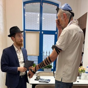 מתחבר למקורות: הצייר היהודי סערז' יאשע, שהגיע ממוסקבה לקלינינגרד לפתיחת תערוכה מציוריו - הניח תפילין עם שליח הרבי בעיר - הרב אברהם ברוך דייטש