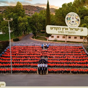 צוות קעמפ 'גן ישראל' ארץ הקודש והחניכים בתמונה הקבוצתית לקראת סיום מחנה הקיץ לשנת תשפ"ה. צילום: חיים טויטו
