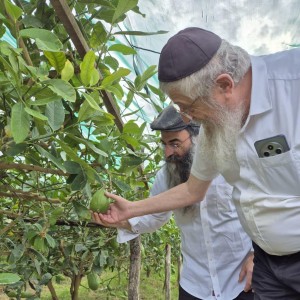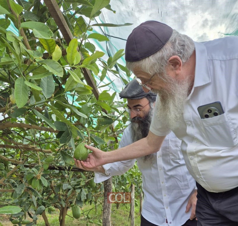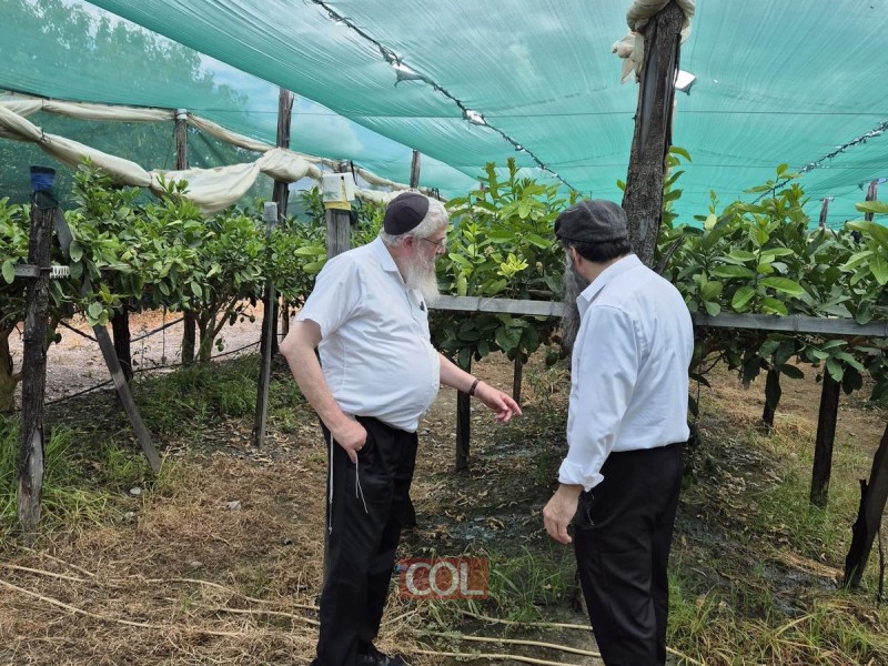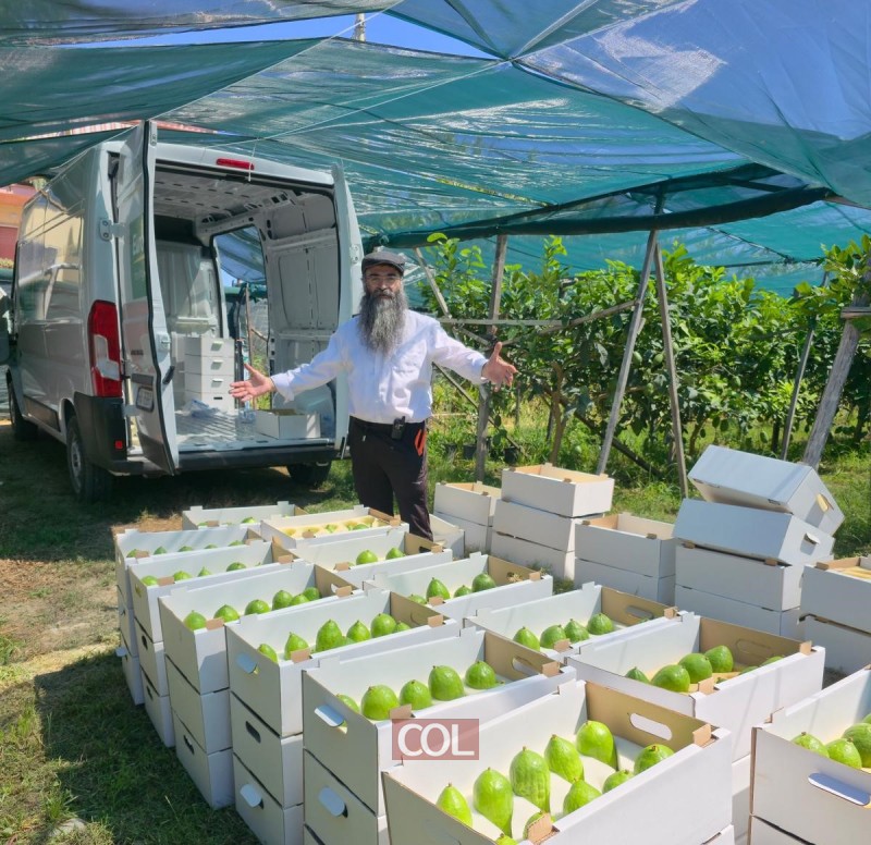 כחודשיים קודם החג: רב קהילת חב"ד בלוד הרב ברוך בועז יורקוביץ' משגיח על כשרות האתרוגים של ר' מרדכי מושיאשוילי ובנו דוד מחברת מסורת אנ"ש, בפרדסים שבקלבריה איטליה