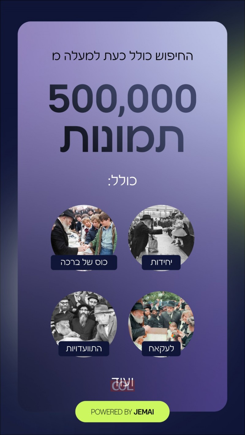 חברת המדיה החב"דית JEM מבשרת על שדרוג מערכת זיהוי הפנים, עם מאגר דיגיטלי המכיל למעלה מ-500,000 תמונות היסטוריות. הפרויקט החדשני מאפשר לקהל הרחב לגשת לאוסף נדיר של רגעים היסטוריים עם הרבי לאורך השנים.