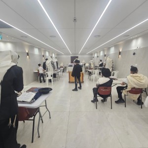 אחד ממנייני תפילת שחרית של ראש חודש אלול, בהיכל התפילה החדש, שחודש לאחרונה, בקומת הקרקע של בית כנסת חב"ד המרכזי ברחובות