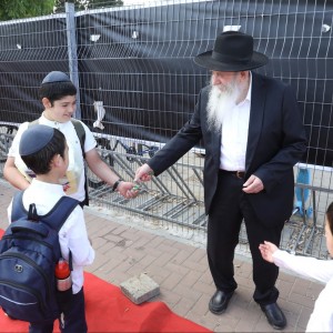 כבר קרוב ליובל שנה: המנהל הוותיק והמייסד של חיידר "אהלי תורה אהלי מנחם" בכפר חב"ד, הרב בן ציון וישצקי, מקבל את פני התלמידים הנרגשים בסוכריות, עם פתיחת זמן אלול