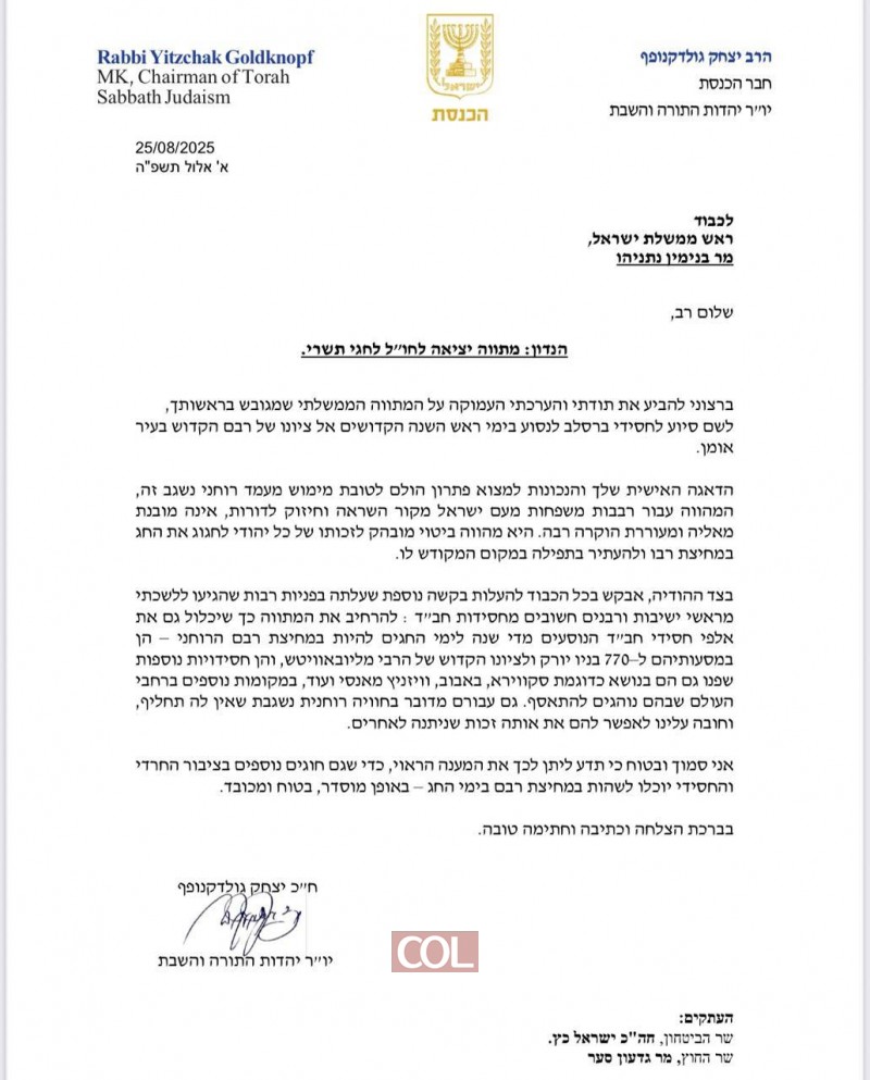 ח"כ ויו"ר יהדות התורה הרב יצחק גולדקנופף, פונה במכתב לראש הממשלה בנימין נתניהו, ולצד דברי התודה על המתווה שהושג עבור חסידי ברסלב שיוכלו לנסוע כמנהגם מידי שנה לראש השנה לציון רבי נחמן באומן, מבקש גם להגיע להסדר שיאפשר לבחורי ישיבה חסידי חב"ד לנסוע לחודש תשרי לרבי, מבלי שיתקלו בעיכוב יציאה או סכנת מעצר, וזאת בעקבות הגזרות החדשות ובעקבות המעצרים שבוצעו לבחורי ישיבות לאחרונה: