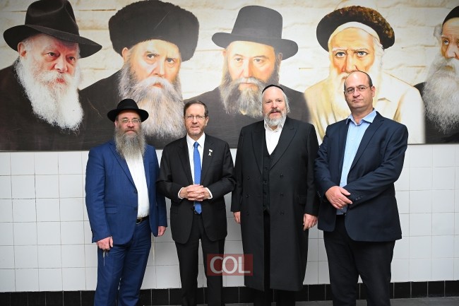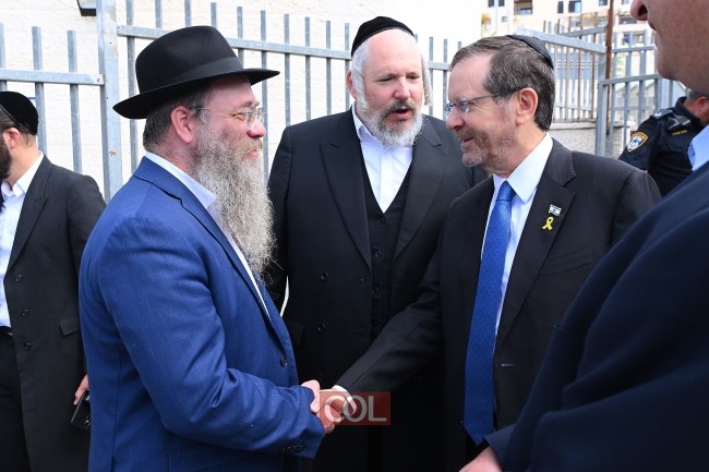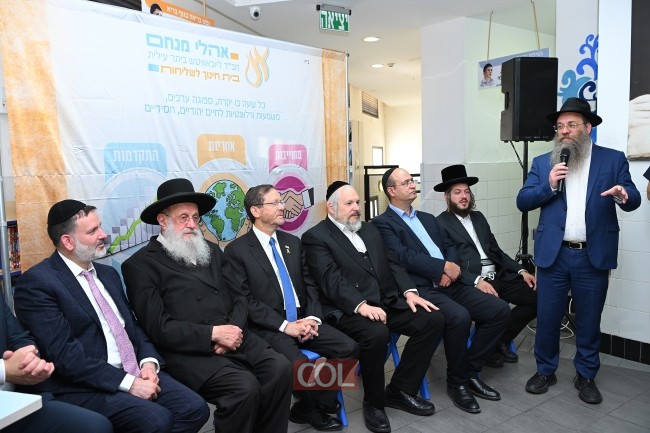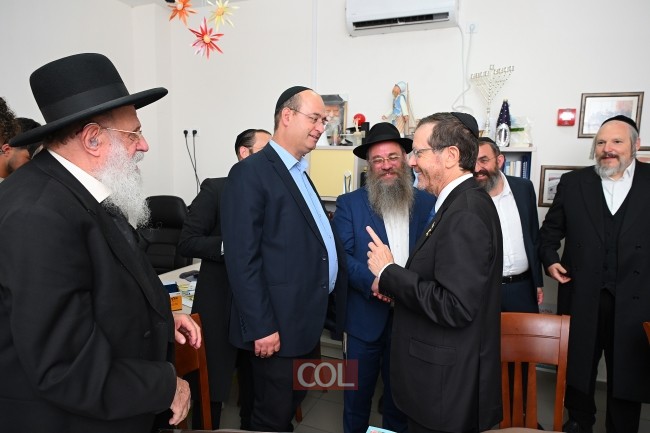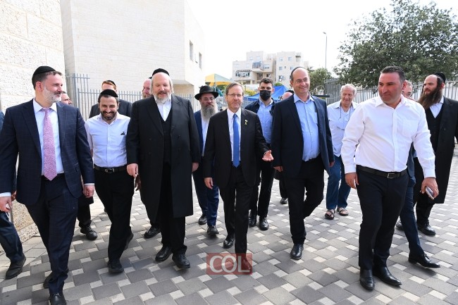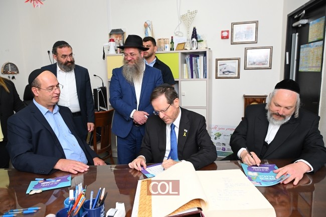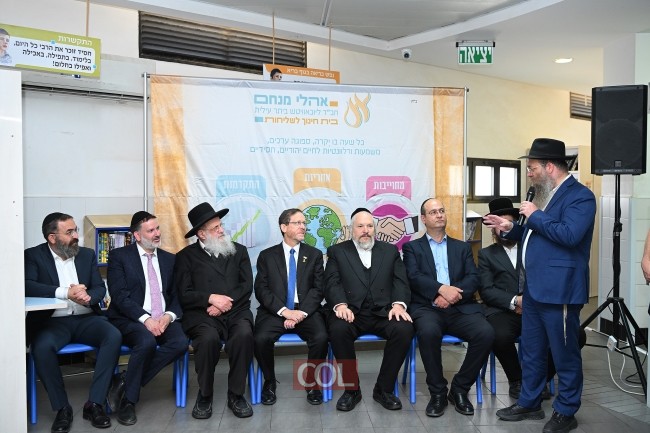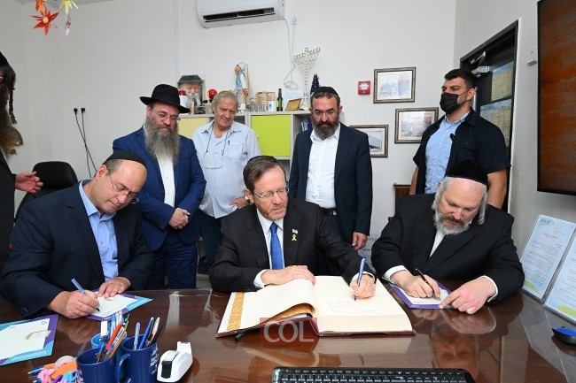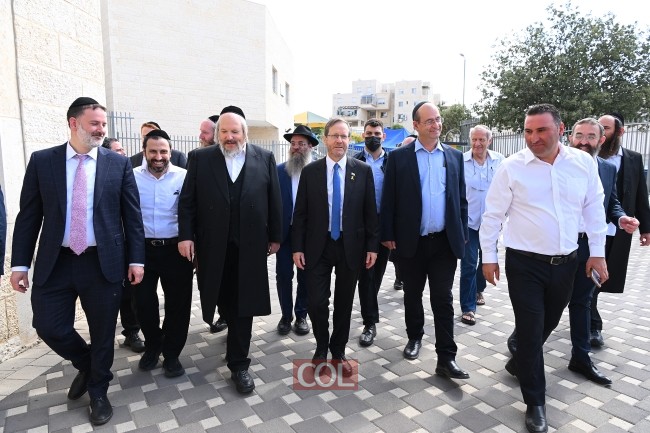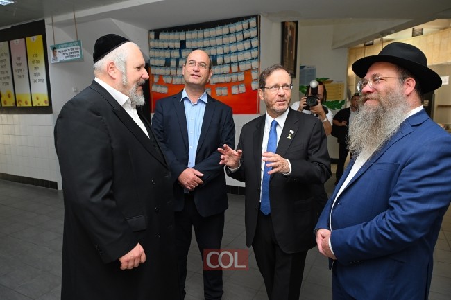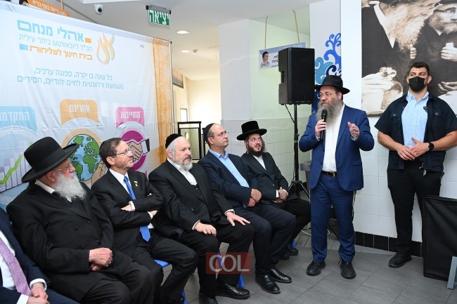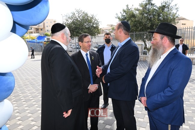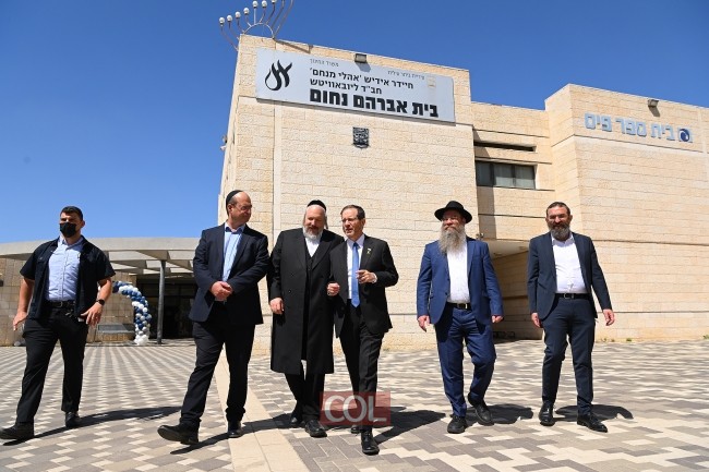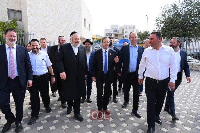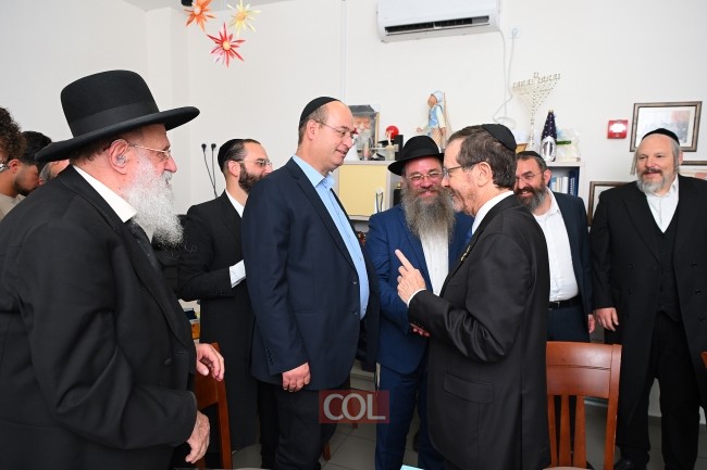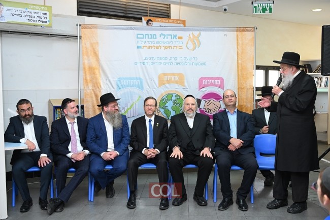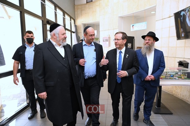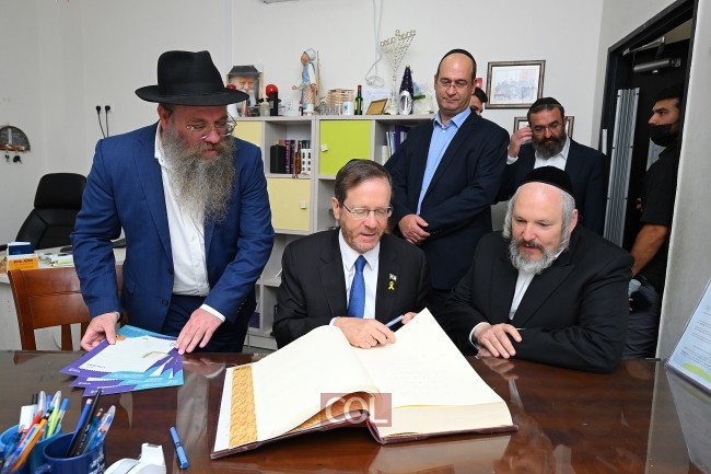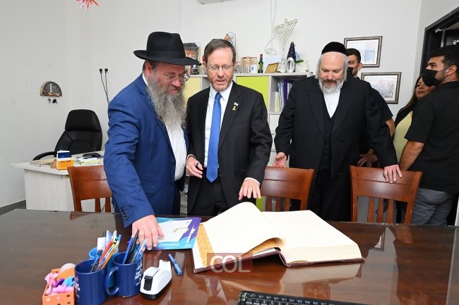 אל הנשיא נלוותה פמליה מכובדת שכללה את ראש העיר, הרב מאיר רובינשטיין וסגניו, מנהל המחוז החרדי מר שי קלדרון, וסגן ראש העיר החב"די הרב מאיר בר לב. האורחים הנכבדים הגיעו כדי לחזות מקרוב בפעילות החינוכית הענפה של מוסדות "אהלי מנחם", הידועים במסירותם לגידול דור של תלמידים חדורי ערכים, אהבת תורה, יראת שמיים ושליחות.