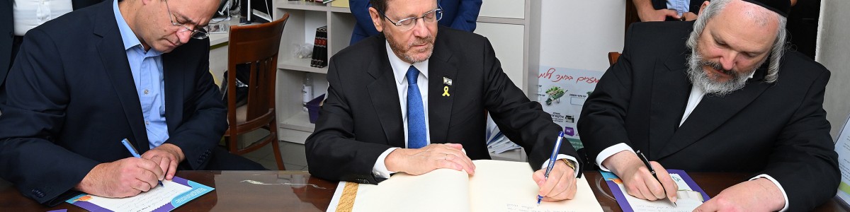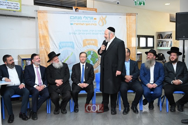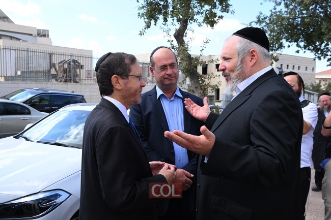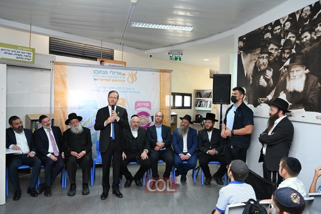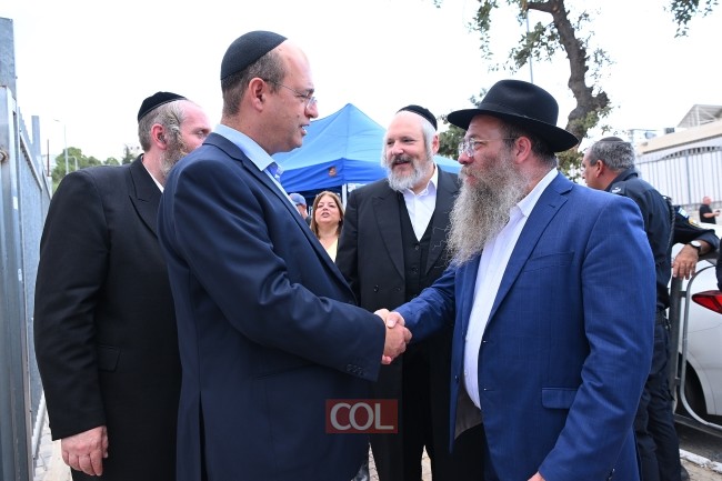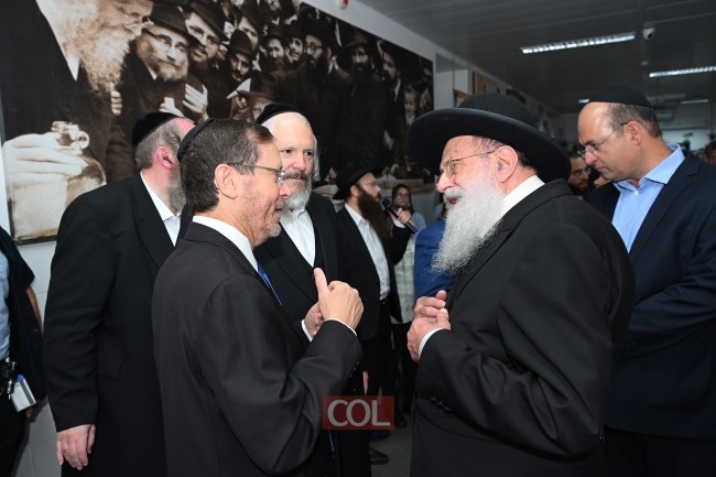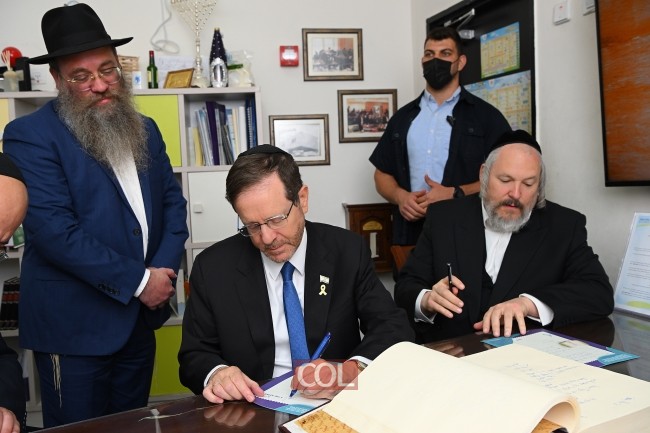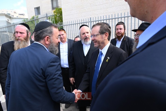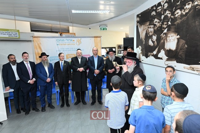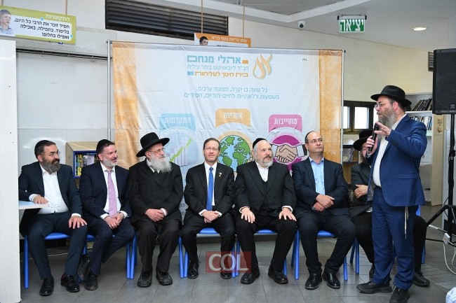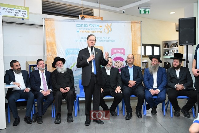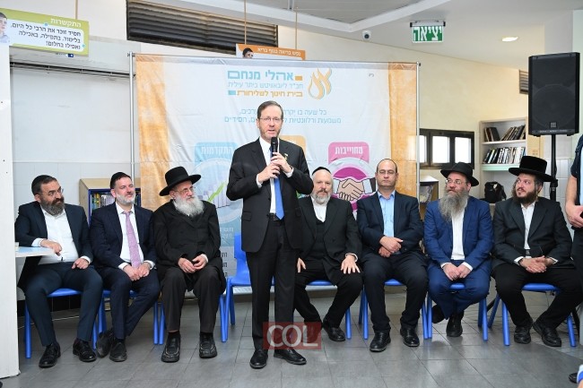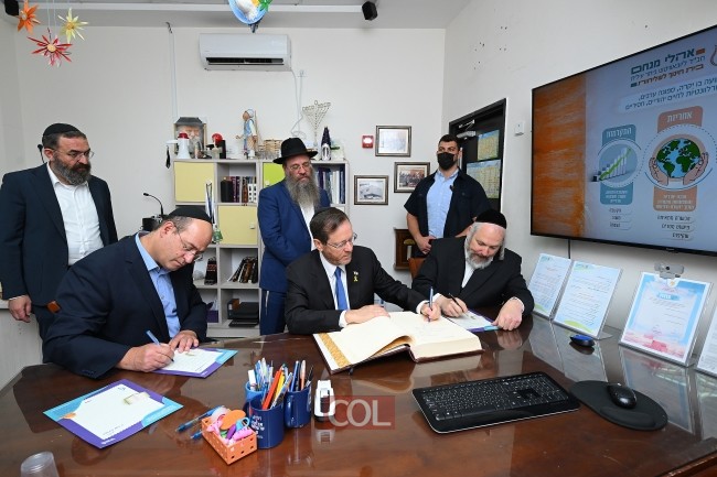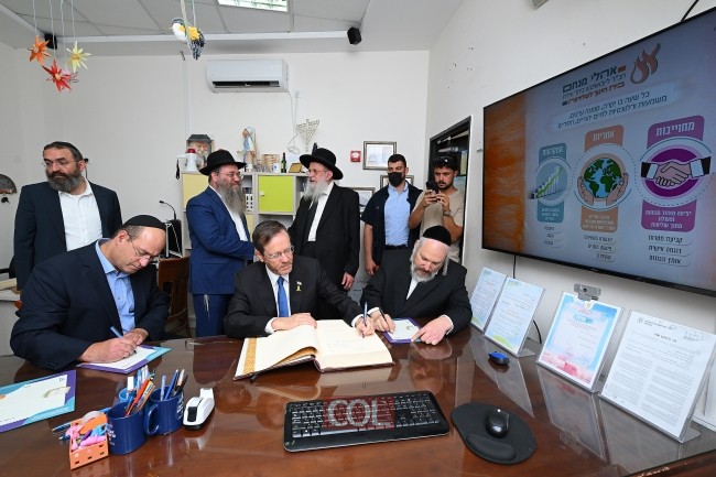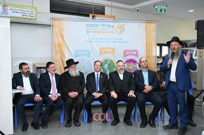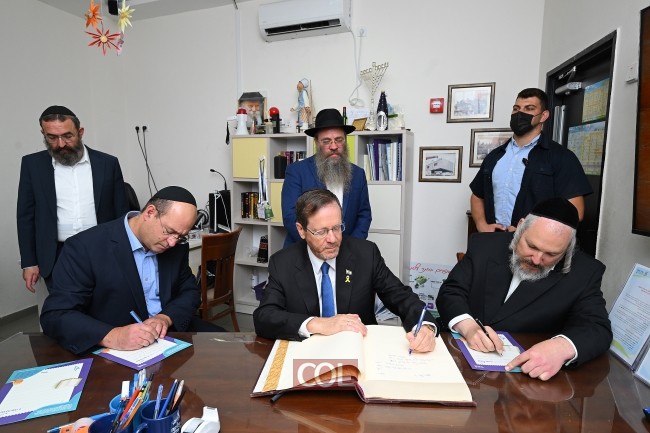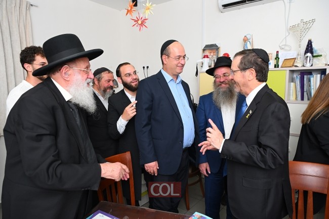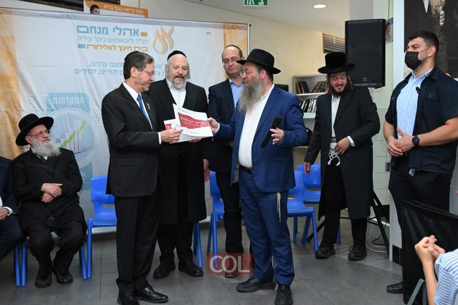 אל הנשיא נלוותה פמליה מכובדת שכללה את ראש העיר, הרב מאיר רובינשטיין וסגניו, מנהל המחוז החרדי מר שי קלדרון, וסגן ראש העיר החב"די הרב מאיר בר לב. האורחים הנכבדים הגיעו כדי לחזות מקרוב בפעילות החינוכית הענפה של מוסדות "אהלי מנחם", הידועים במסירותם לגידול דור של תלמידים חדורי ערכים, אהבת תורה, יראת שמיים ושליחות.