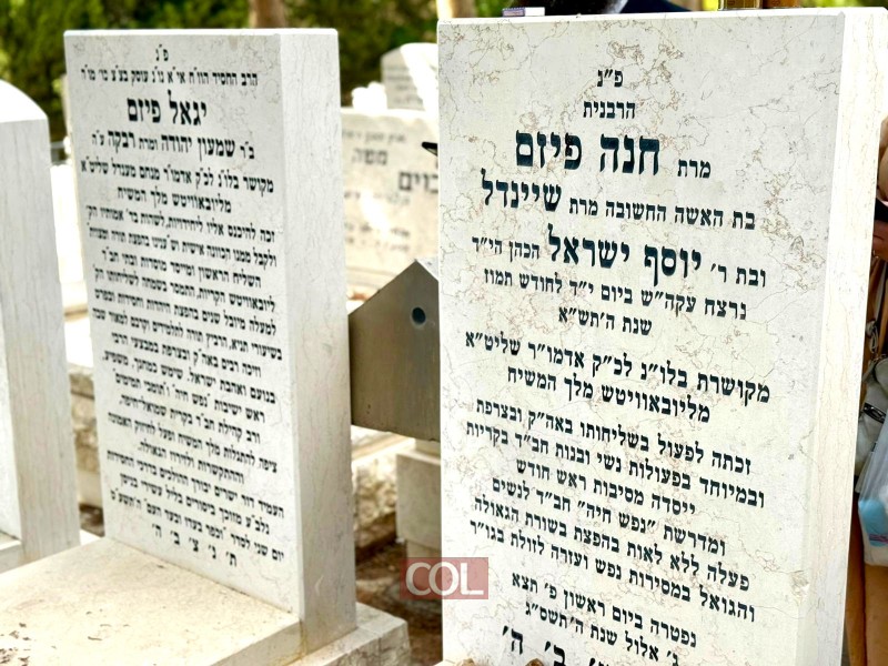 בני משפחת פיזם עלו הבוקר (רביעי) לבית החיים הישן בחיפה לקבר של אימם השליחה הרבנית חנה פיזם ע"ה, אשת הרב יגאל פיזם ע"ה, השליח הראשון ומייסד מוסדות ובתי חב"ד ליובאוויטש הקריות, לרגל מלאות 22 שנים לפטירתה ביום ג' אלול ה׳ תשס"ג
