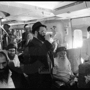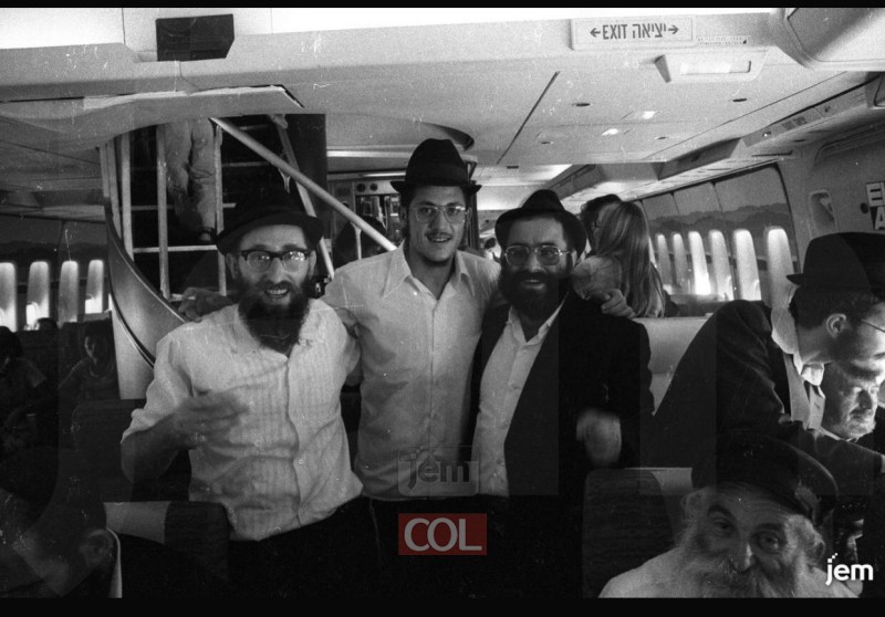 קבוצת חסידים בטיסה לחצרות קדשינו בשלהי חודש אלול, אחד החסידים תוקע בשופר לזכות את הנוסעים | נראים מימין החסידים הנודעים, הרב דוד חנזין והרב בערקע חן ע"ה | מזהים חסידים נוספים?