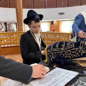 במזל טוב: התמים יהושע מרדכי, בן המחנך הרב מנחם מענדל מרקוביץ ממוסקבה, בברכת 'הגומל' בבית הכנסת המרכזי, לאחר שובו מחצר הרבי, לרגל חגיגת בר המצווה שלו (צילום: שייע בטוויטר)