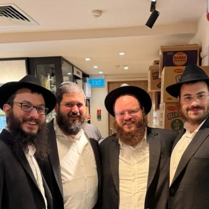 שלוחי הרבי בהודו - הרב ישראל קוזלובסקי, הרב אורי בלוי והרב נחום רוזנברג, בתמונה משותפת עם הרב מענדי קוטלרסקי מ'מרכז 302' ב'מרכז לענייני חינוך', בכינוס השלוחים באסיה שנערך כעת בסינגפור