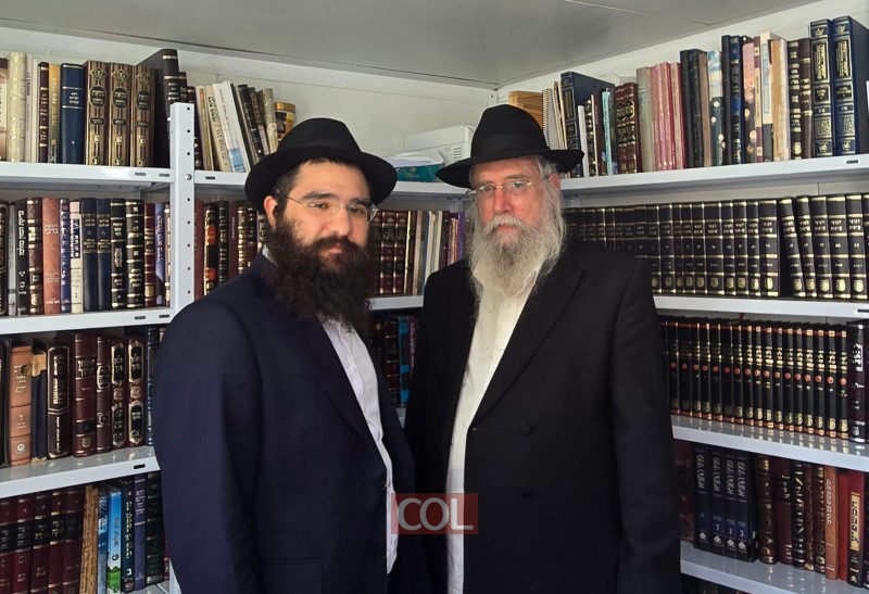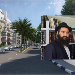 הרב הרשקוביץ והרב הרטמן על רקע הדמיית השכונה שהתאכלסה