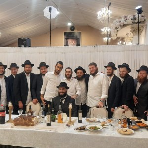 חברי החתן התמים יהודה ישראלי בוגרי הישיבה בקרית גת בתמונה משותפת בעיצומה של השמחה באולם האירועים בכפר חב"ד