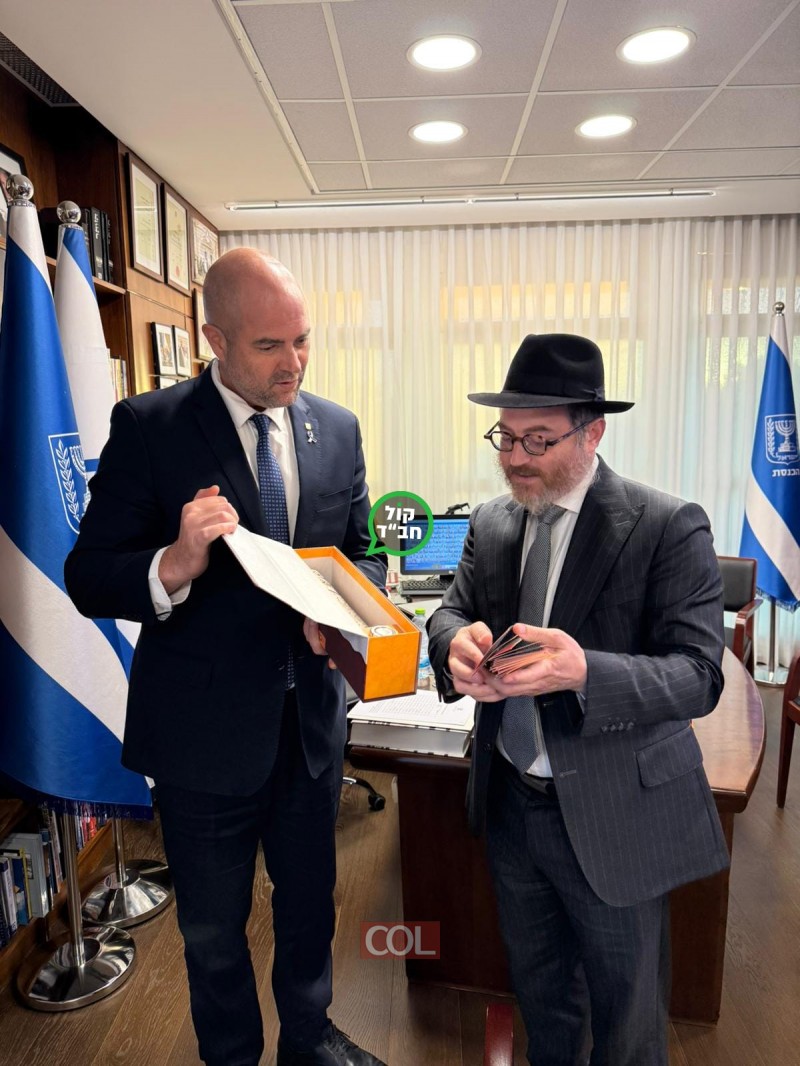 יו"ר הכנסת אמיר אוחנה אירח בלשכתו את נציגי חב"ד - הרב שמואל אוירכמן, מנהל קשרי הממשל מטעם אגו"ח, והרב שימי סגל, שליח הרבי בכנסת ודובר חב"ד.