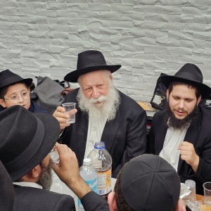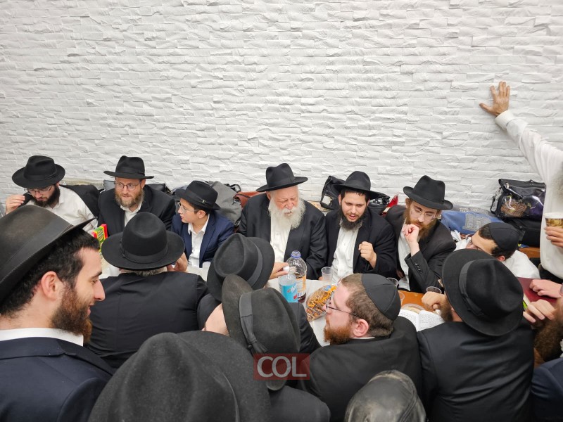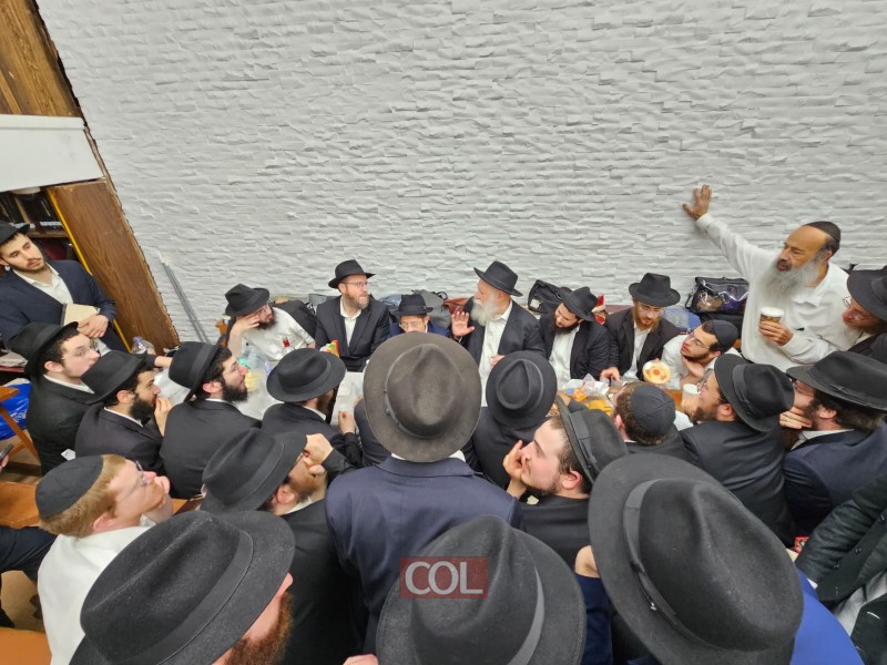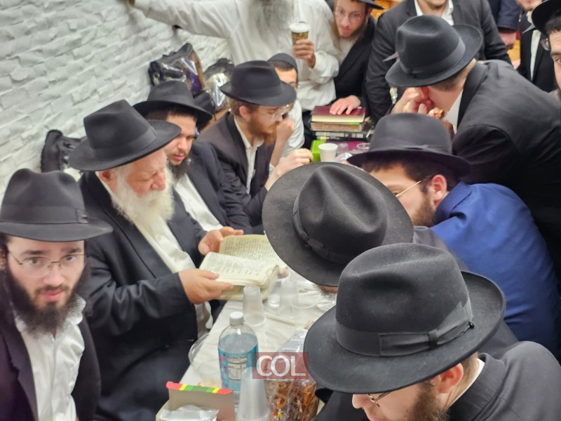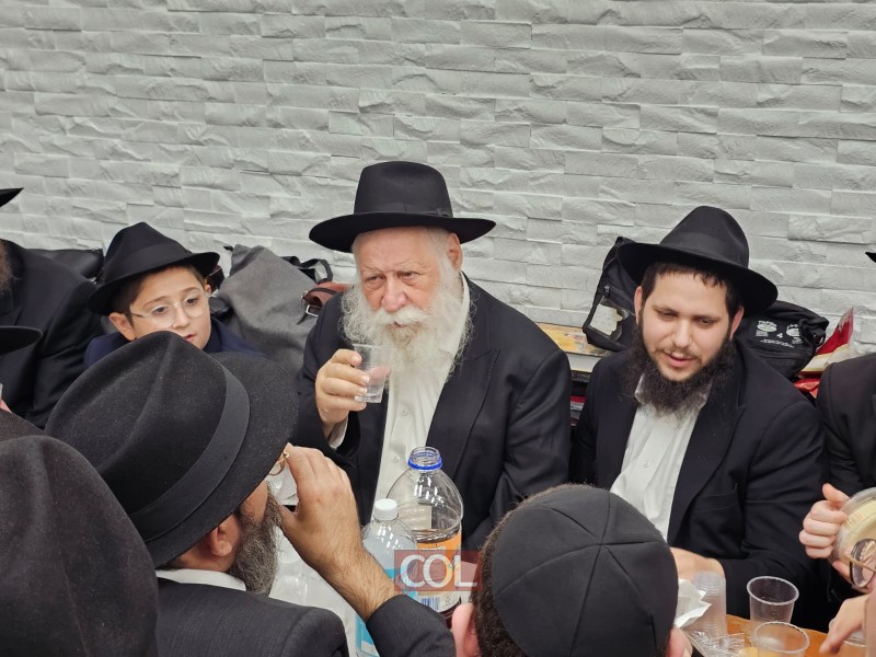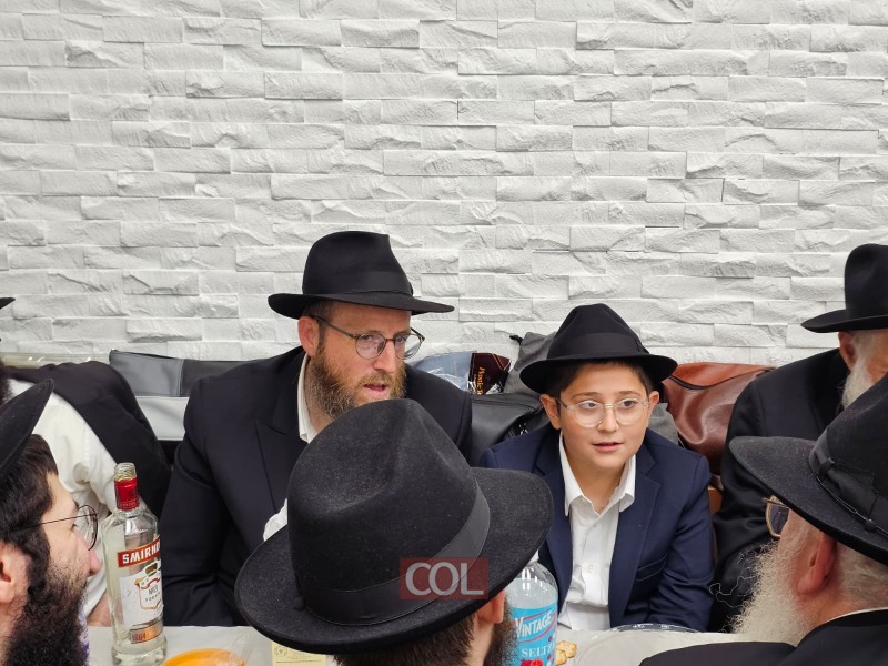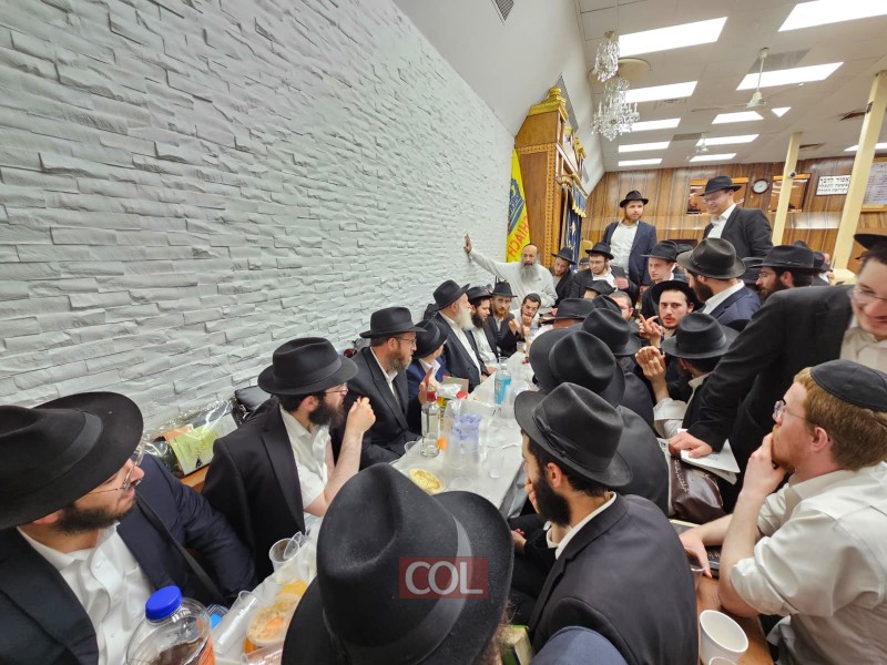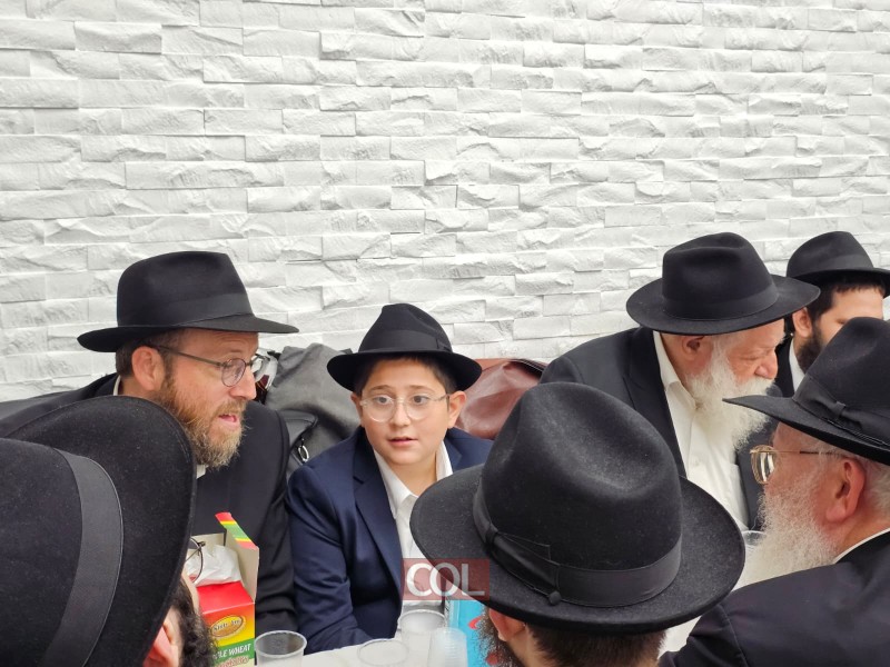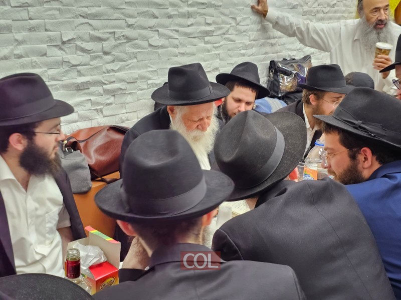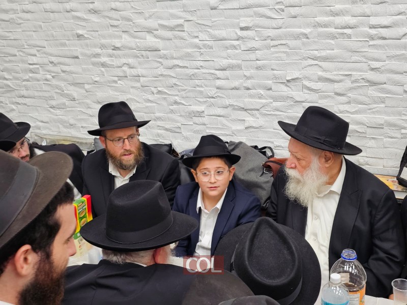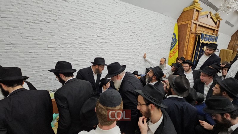 הרב בומי פרידלנד מתוועד לאחר תפילת שחרית ב-770, לרגל הנחת התפילין לנכדו. צילום: מנדי עקיבא, COL