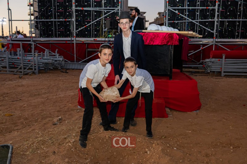 את אבן הפינה, הניחו על פי הוראתו של הרבי, הילדים - השלוחים הצעירים של משפחת רבינוביץ. לאחר מכן, חבשו הרבנים והתורמים את הכובעים המסורתיים, וכיסו בכפות את 'אבן הפינה'.